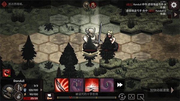 4、在推进过程中遭遇敌人会触发战斗,界面中间的四个图标对应角色的技能,每个技能具备不同的作用范围,待敌人被全部消灭后战斗即可结束。