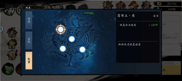 3,接着去点观星功能!观星的入口在界面右上角,在观星点数还没点满的情况下是可以重置的!如果喜欢刷图的话,记得把朱雀系里的体力恢复加速点出来!之后再去点旁边挂机时长后面的选项!