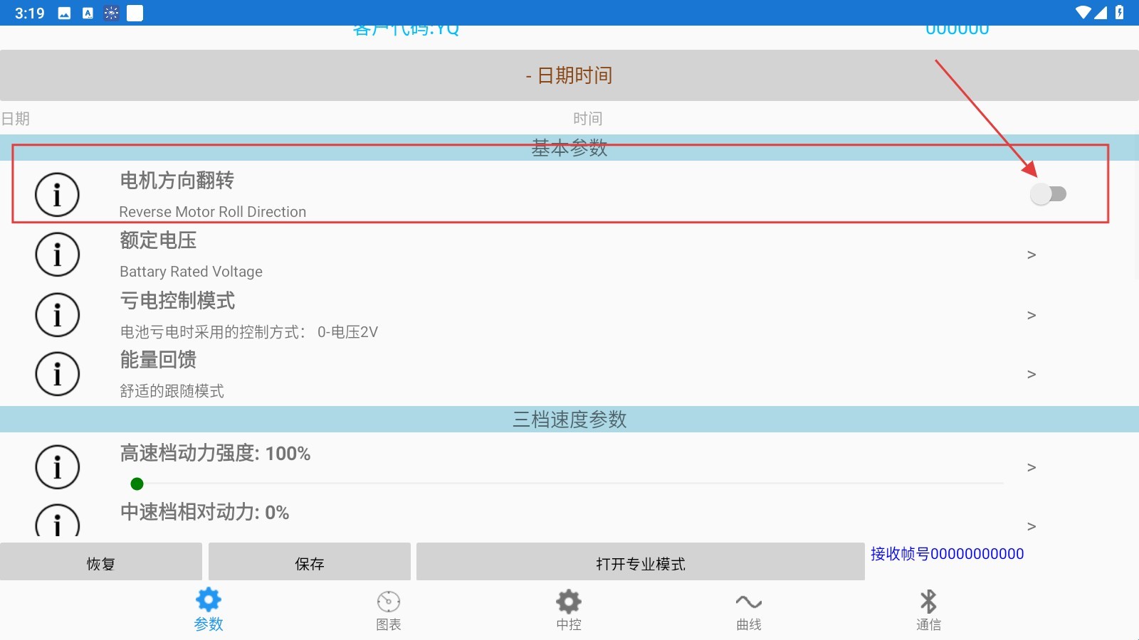 1、进入【参数】页面后,找到并点击【电机方向翻转】的开关按钮,即可切换电机的转动方向。