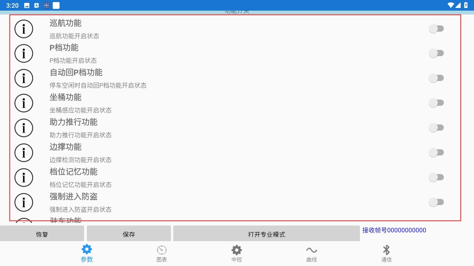 2、在【参数】页,找到巡航、P档等功能开关,点击开启/关闭对应功能。