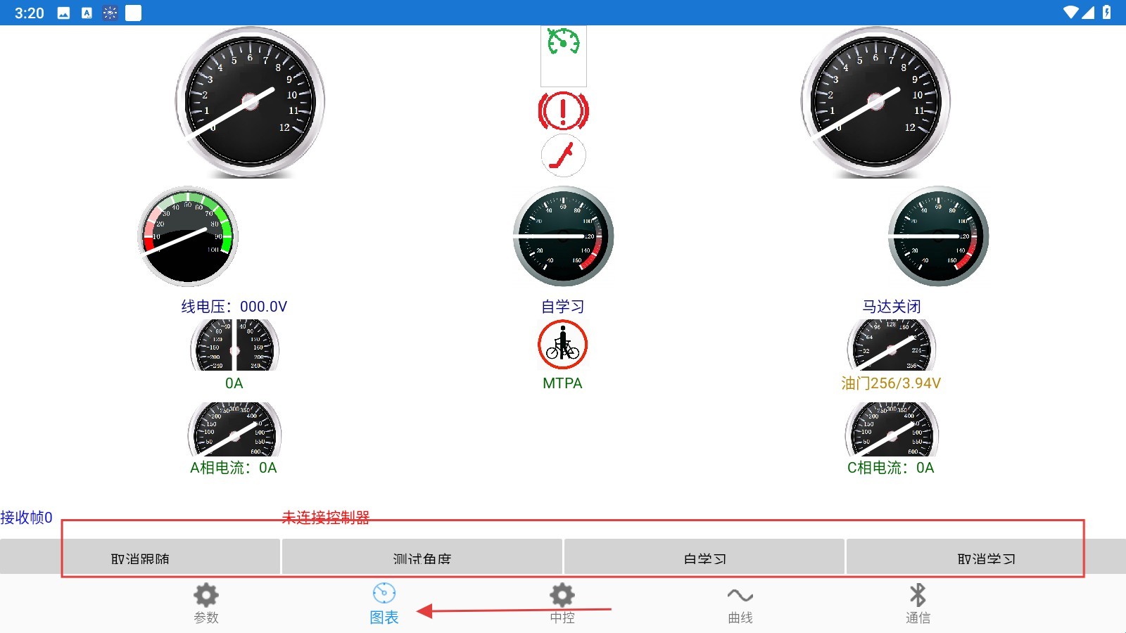 3、切换到【图表】页,点击【取消限暗】【测试角度】等按钮,执行电机调试操作。