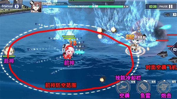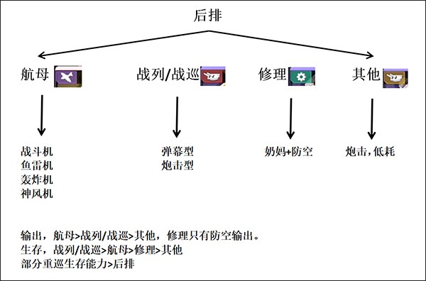 后排是主要的输出担当,同时也能处理前排漏过来的自爆船;此外还可以选择专职修理舰或者带治疗功能的舰船来维持队伍血量。后排会受到自爆船和空袭的伤害,所以在防空压力大的关卡里,要优先提升防空能力而非一味堆叠输出。