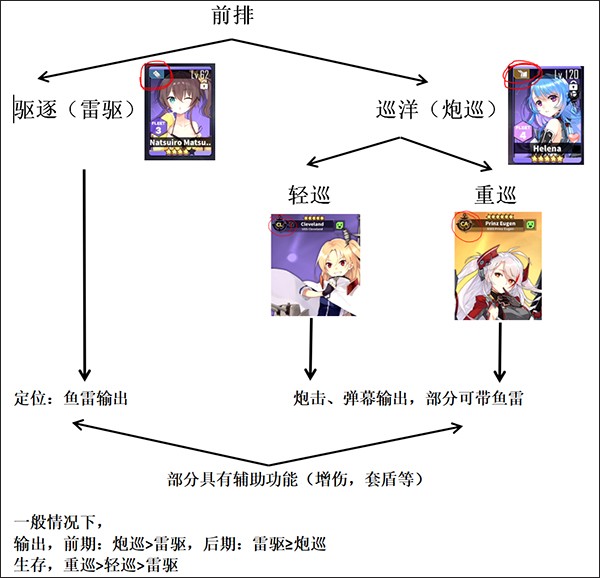 前排舰船的炮击频率取决于主副炮的射速属性,防空圈的覆盖范围由高射炮的射程决定;驱逐舰释放鱼雷需要等待技能冷却完毕,在前期装备配置不佳时,其伤害表现不如炮巡,加之驱逐舰自身较为脆弱,因此前期建议优先以炮巡作为主要的养成对象。