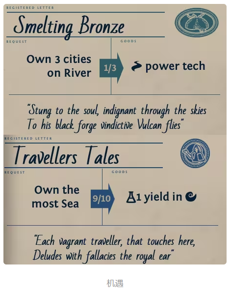 机遇每回合奖励两个机遇中的一个。正确的管理和选择这些机遇是成功的关键。机遇的具体信息可以通过按左边的皇冠来访问。有三种类型的机遇。