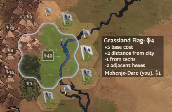 任何中立地块在你的边界可以被占领,通过插旗来宣称。旗帜的成本有一个基本成本,不同类型地块价格不同。价格还取决于离最近城市的距离,每一格增加1单位的食物消耗。每相邻一个己方地块会减去1单位的成本。解锁扩张插旗科技也可以减少扩张成本。