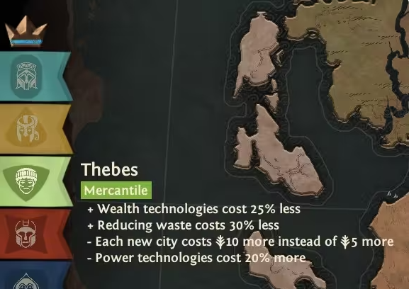每一种地形都能带来知识、财富和食物。该地形类型的每个瓦片提供的数量可以通过技术增加。通过计算每一种地形解锁的技术数量,可以很快地了解到该地形的产量。