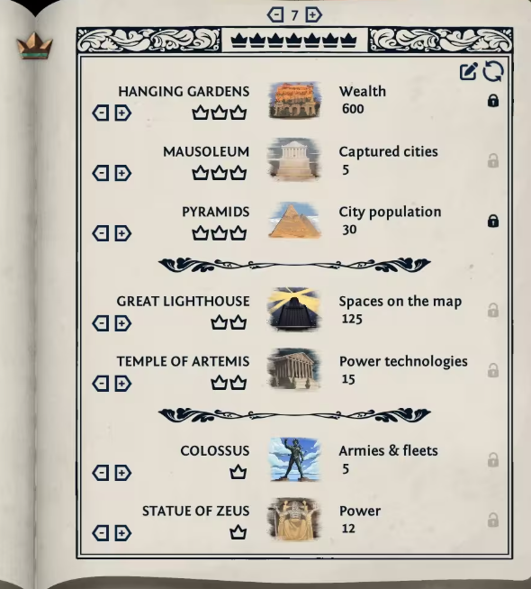 在这里你可以设置获胜所需的胜利点数(最多10),以及7个奇迹所奖励的胜利点数(0~4)。调整胜利点数的数量也会改变完成需求。你可以“锁定”单个奇迹,并在需要时重新选择其他奇迹。(目前,您必须重新roll选一次才能显示锁符号)。对于征服型的游戏,移除除大灯塔外的所有奇迹,并让它奖励4个胜利点。这意味着获胜的唯一方法是控制地图上的每一个地块。