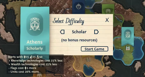游戏难度:你可以选择通过增加财富收入来给自己或AI带来优势。每个文明的难度都不尽相同,游戏给出了难度估计。