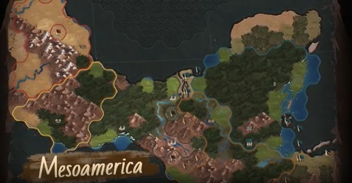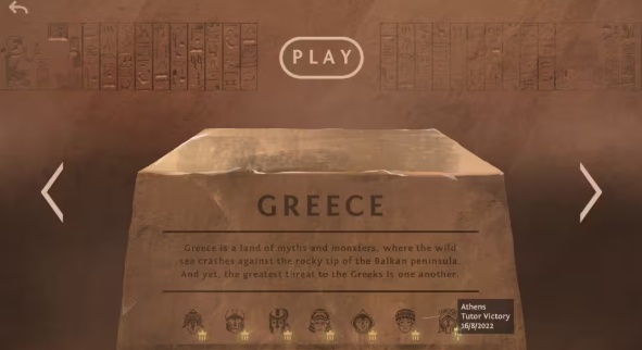 这个菜单允许您通过单击箭头来选择地图。在石头的底部,显示了可用的文明的符号。你的胜利将被记录在文明图标右下角的金色图标里。