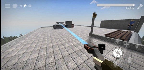 2、左侧控制移动,右侧负责射击,点击左上角可切换武器。用当前武器点击物体时,会出现蓝色引线将它们连接,之后你就能通过滑动屏幕来调整这些物品的位置了。