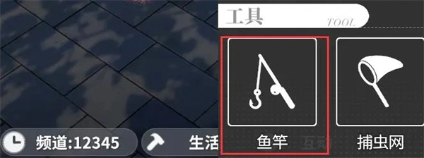 3、这根鱼竿会显示在屏幕下方的互动选项栏中,玩家只需点击鱼竿即可完成装备,之后需要找到一处水域,接着简单挥动鱼竿,再选择合适的鱼饵箱,就能顺利进行钓鱼操作了。