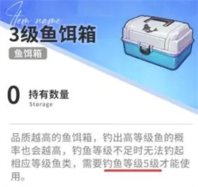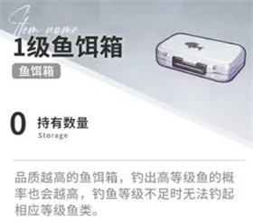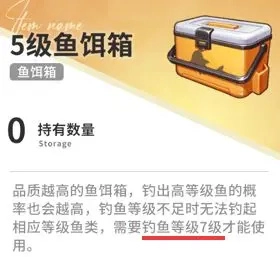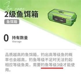 2、2级鱼饵箱:需钓鱼等级不低于3级方可使用,使用时钓出当前钓鱼等级及以下对应所有产物的概率较低;钓出垃圾的概率较高,而钓出3级、4级海产的概率则有大幅提升。