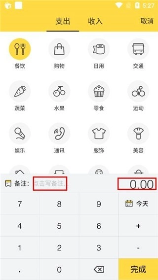 2、点击下方的记账加号按钮,选择支出或收入类别,即可完成在线记录操作。