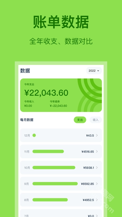 支持月、年收支统计,数据智能分析,往期对比,资产走势,分类统计,标签统计,预算统计等,让用户清晰掌握自己的财务状况。