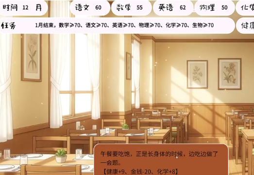 3、主角的心理状态影响学习效率,低值时需通过互动恢复。