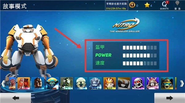3、在机器人选择界面,查看并选择具有不同【盔甲】-【POWER】-【速度】属性的机器人,为战斗做准备。