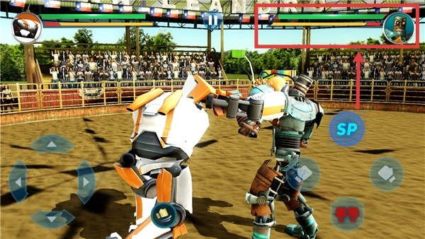 4、战斗时用方向键控制机器人,攻击积攒怒气后,点击【SP】按钮释放必杀技,击败对手。