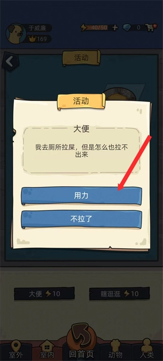 1、在大便互动弹窗中,点击红色箭头指向的用力按钮,完成狗狗的对应互动,推进养成流程操作。