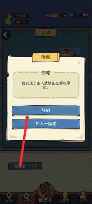 2、遇到偷吃互动事件时,点击红色箭头指向的狂叫按钮,触发对应的互动剧情,积累养成进度。