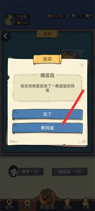 3、在瞎逛逛互动界面,点击红色箭头指向的孵鸡蛋按钮,选择该互动选项,推进狗狗的趣味流程。