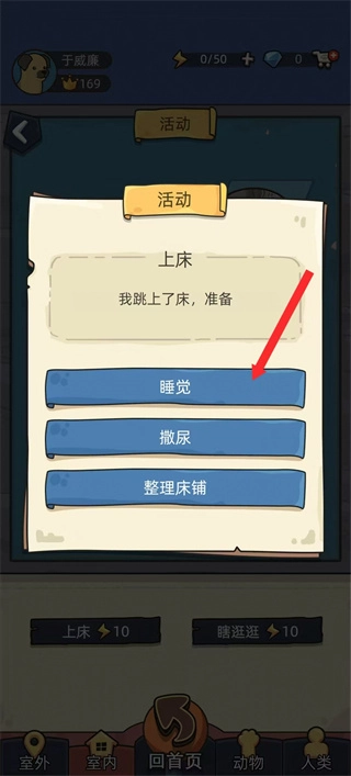 4、进入上床互动弹窗后,点击红色箭头指向的睡觉按钮,完成狗狗的休息互动,持续推进角色养成。