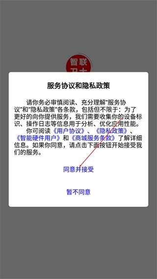 打开应用后,当弹出“服务协议和隐私政策”窗口时,点击【同意并接受】按钮,以此确认相关条款内容。
