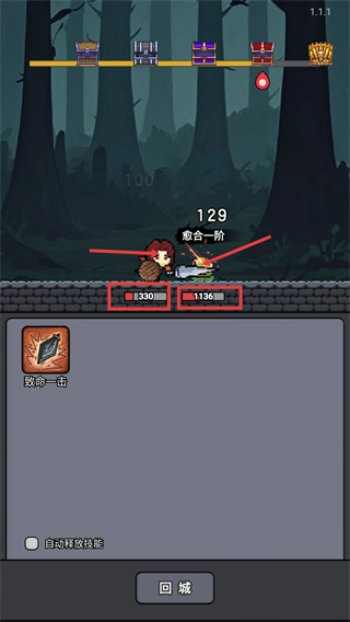 3、关卡战斗中,敌方显示【1136-血量】时,可释放【致命一击】技能,并借助【愈合一阶】回复自身血量,维持战斗状态。