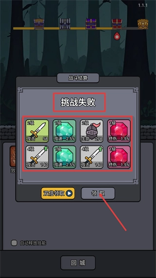 4、【挑战失败】后点击【领取】,可获得【2级-攻击-58】装备、【1级-攻速-2.5%】宝石等资源,用于强化角色属性。