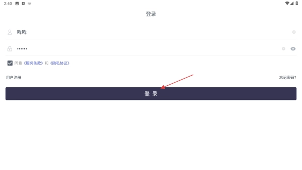 2、在输入框内填写【用户名】与【密码】,同时勾选【同意《服务条款》和《隐私协议》】这一选项。