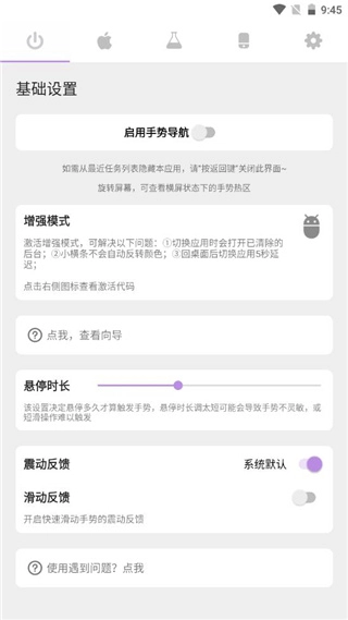 gesture,Gesture是一款专业度很高的手机手势导航软件,其安卓版本(小横条)支持用户在手机上设置和添加各类便捷手势,动作的响应方式可由用户自由设定与更改,还有丰富的服务可供选择,让手机使用体验更加顺畅顺手。这款软件能实现快速返回、任务切换、应用启动等常用操作,大幅提升手机操作的便捷性与效率;它不仅兼容基础的滑动、点击等手势操作,还配备了自动变色、横屏防误触等实用的高级功能。