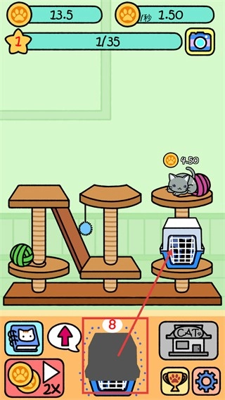1、在主界面点击底部标有数字的【箱子】,将其放置到猫爬架区域,触发猫咪生成,同时开始获取猫爪币。