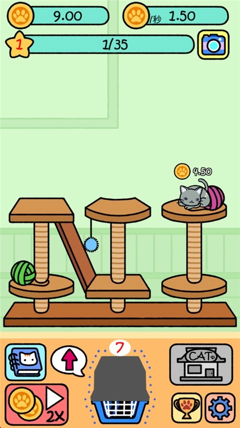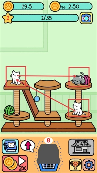 箱子放置好之后,猫爬架会吸引来多只猫咪(像第二张图里的白猫和灰猫),这时候猫爪币的数量和每秒收益会一起增加,让收益资源能持续累积。