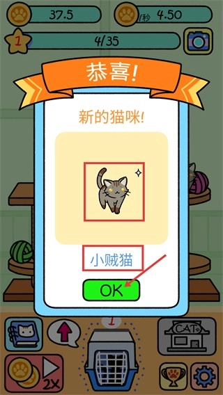 3、解锁“小贼猫”这类新猫咪时,点击弹窗里的【OK】按钮确认,新猫咪就会进入场景,帮助提升后续收益或解锁更多功能。