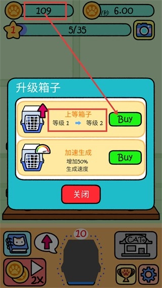 4、当猫爪币积累到足够数量时,进入【升级箱子】界面,点击【Buy】按钮来升级“上等箱子”,从而进一步提高猫爪币的获取效率。
