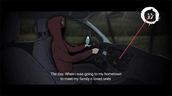 2、当前界面展示剧情文本,查看这段返乡相关的剧情后,点击右上角的交互图标,推进游戏的剧情发展流程。