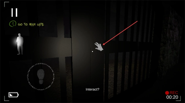 4、看到提示后,当大门上出现Interact的交互提示时,点击手形图标与对应元素互动以推进流程。