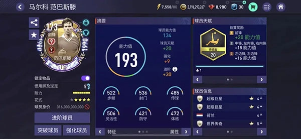 光荣岁月典藏范巴斯滕,能力值更新,和限定罗纳尔多同级球员,基础能力值貌似略高于限定大罗,范巴斯滕也是笔者非常喜爱的锋线球员,进攻能力非常强,游戏内射门精准,劲爆,面板数据当下T0级别,限定球员推荐大罗(氪佬,无须多言)、德罗巴(就没见过魔兽虚过,游戏现实亦是如此,猛的一批)、四周年之星伊布(具体表现未知,按照以往的伊布,应该表现不俗)、年度哈兰德(常见强力前锋)、白色情人节巴蒂(神经刀,进阶越高越强,总感觉没有之前推出的星星巴蒂那么惊艳)