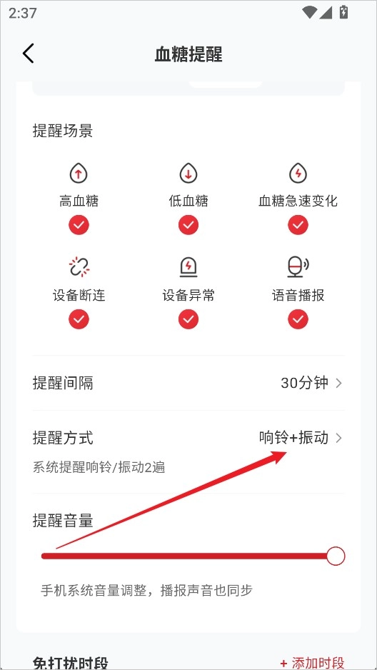 在提醒方式中进行选择,可切换为震动或关闭语音。