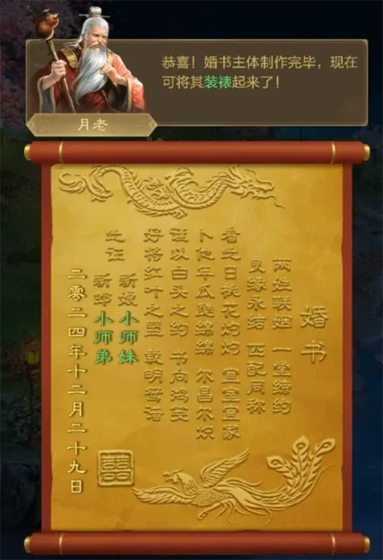 当新郎新娘的婚车都顺利护送完成后,就可以立即开启婚礼副本举办婚礼。婚礼副本开启后,新郎新娘会直接进入副本,并且向各自的亲友发送婚礼邀请,亲友同意后就能进入婚礼副本。其他玩家也可以通过和月老对话的方式进入婚礼副本。