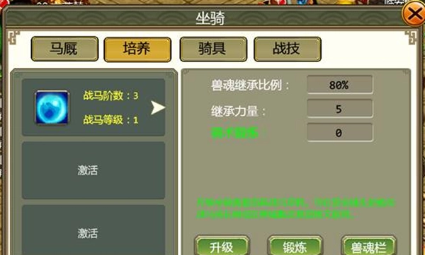 为坐骑系统新增马厩、培养、骑具、战技四个界面,玩家获取的所有坐骑都能存入马厩。