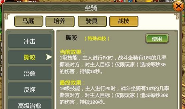 呈现主角已掌握(或尚未掌握)的基础坐骑技能详情、特殊技能详情(涵盖等级情况与功能说明)