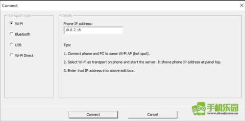在连接对话框里,选择Wi-Fi作为传输方式,然后输入电话的IP地址。