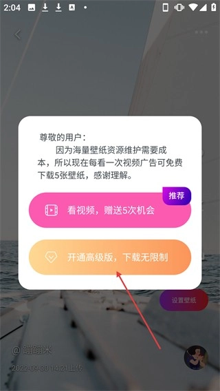 在弹出的窗口里,你可以选择【开通高级版,无限制】这个选项,以此来获取壁纸权限。