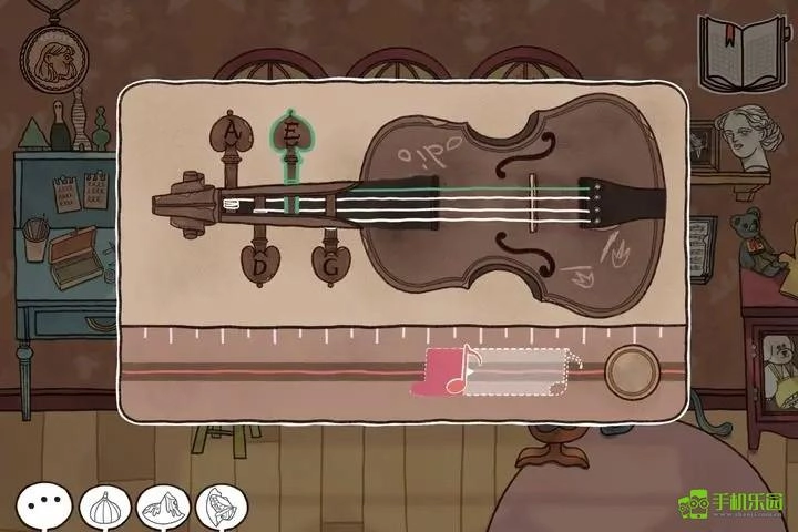 【女主1908】点击小提琴,游玩游戏,得到纸--在音符对准时点击右侧圆形按钮(可以在即将对齐时点击),如果有一长段表示按住不动,4根弦难度逐级增加,最后一段虚线音符也会移动