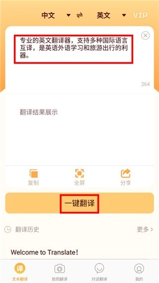 4、点击一键翻译即可完成转换,此外支持的语言方向包含中英、英中、中日、日中、中韩、韩中等,助力你便捷达成英语翻译、英文拍照翻译、日语拍照翻译、韩文拍照翻译等操作。