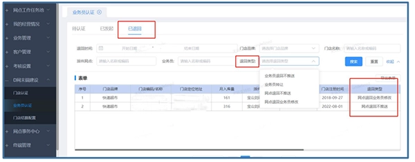 路径:D网末端建设-业务员认证-已退回-退回类型