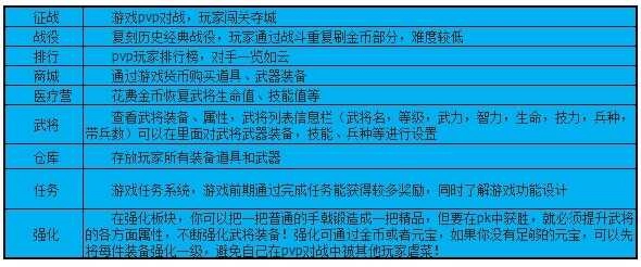 细心的主公想必会留意界面功能,这里有征战、战役、排行、势力、任务等几大战斗模式,而医疗院、商城、武将、仓库、强化等功能,则能帮助恢复名将属性、强化装备,还能学习高级技能、兵种、兵阵等内容。