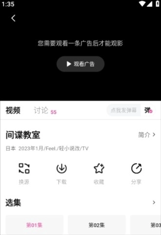 2、比如这里选择这个间谍教室,虽然这里会显示需要看广告才能观影,但其实是不需要的,点击就能直接播放。