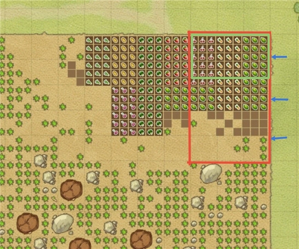 ●下图里红色方框圈出的区域是一个秘银垄,绿色方框对应的是秘银水壶最大蓄力时能覆盖的范围,在蓝色箭头所指的位置进行三次最大蓄力浇灌,就能把秘银垄完全覆盖到。一个秘银垄有135格,而秘银水壶的容量是300,所以一壶水足够浇灌两个秘银垄。