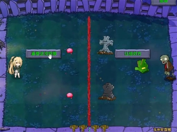 2、玉米娘扔完所有子弹后会开启下一轮,这一轮的投掷如果自己承受就会作用于自身,让给对方则会作用于僵尸,累计获得两次胜利即可通关。